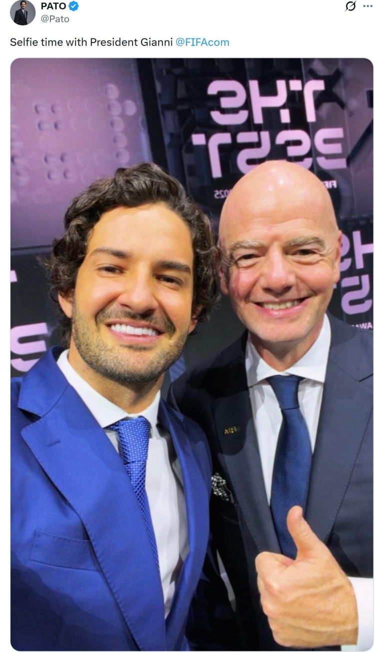 帕托出席FIFA2025年颁奖典礼,更新社媒晒他与因凡蒂诺的合影