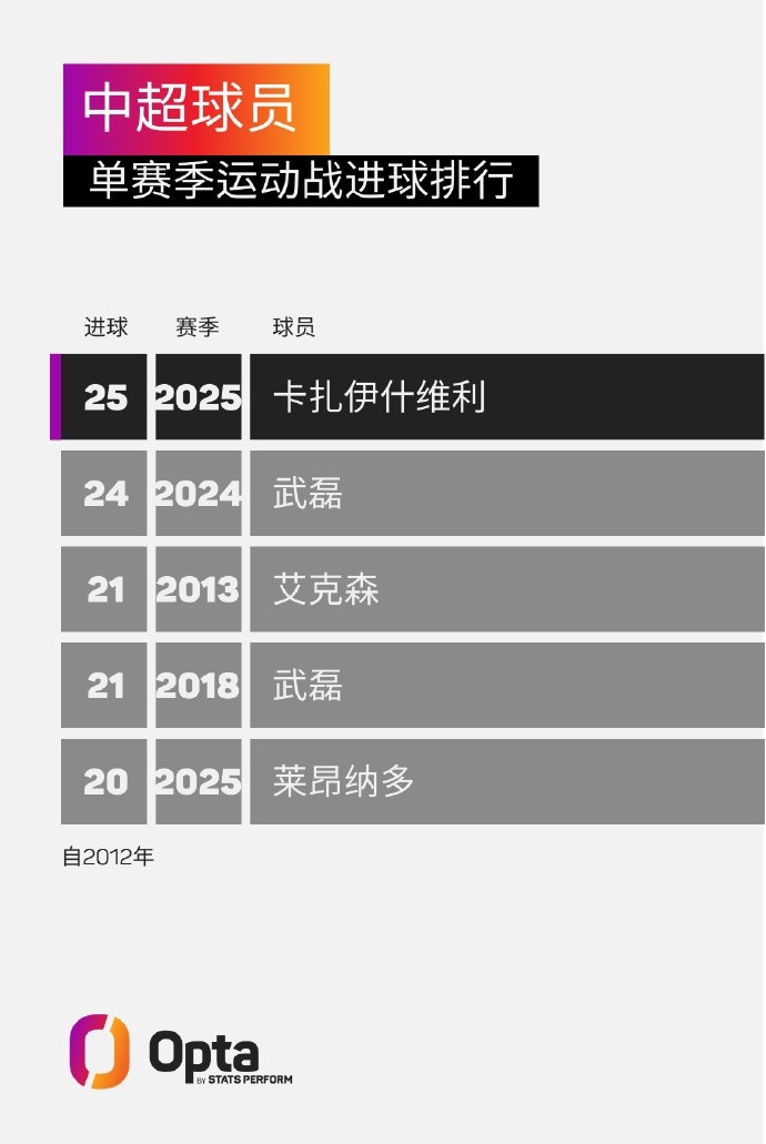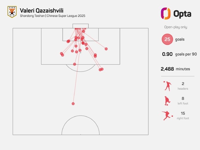 >卡扎伊什维利本赛季运动战进25球,刷新单赛季中超运动战进球纪录