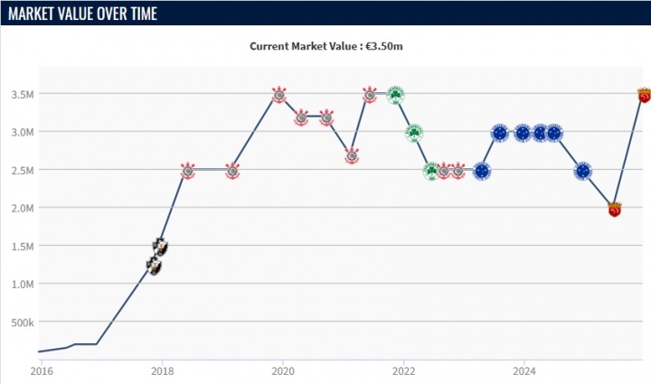 他21岁效力于科林蒂安时以及23岁效力于帕纳辛纳科茨时身价都曾达到过350万欧。