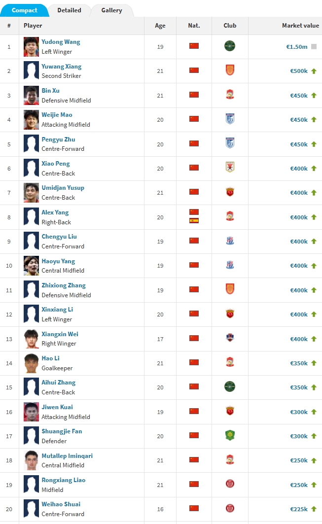 中国U21球员身价排行↓