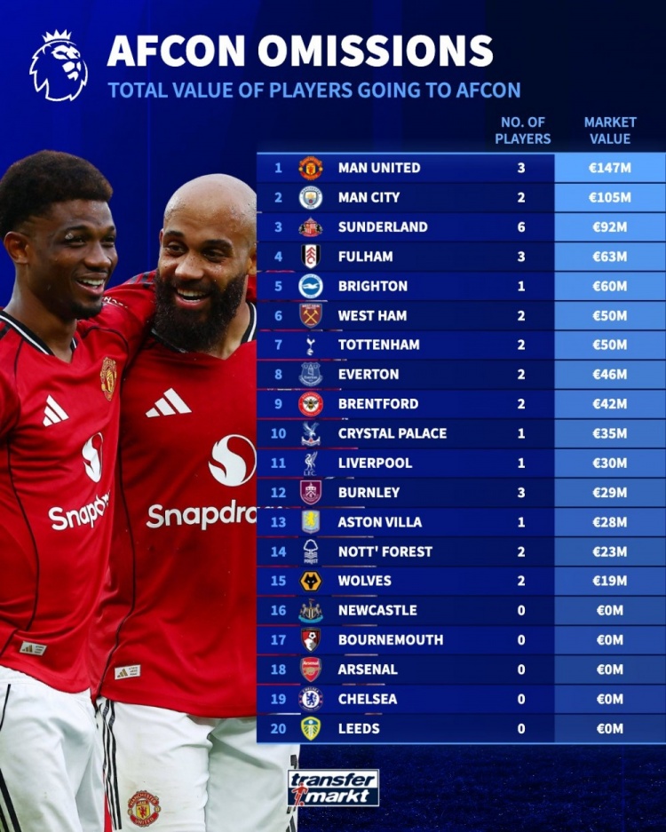 直播吧12月17日讯 非洲杯即将战火重燃,《转会市场》也统计了因为要参加非洲杯而离队的英超各队身价损失榜,曼联居首。