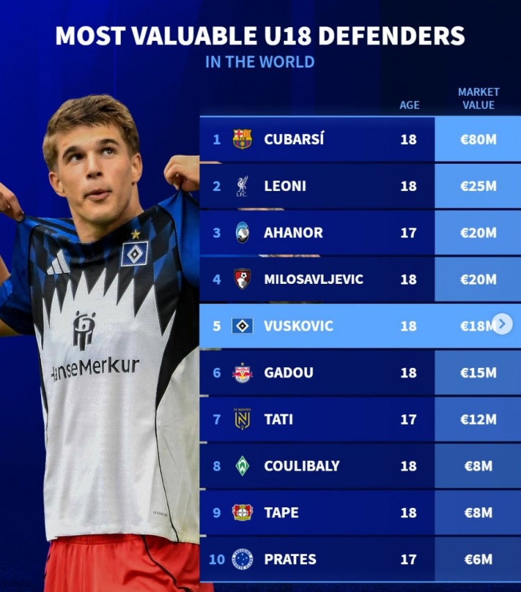 直播吧12月17日讯 《转会市场》统计了当前U18后卫身价情况,库巴西以8千万欧元断崖领跑。