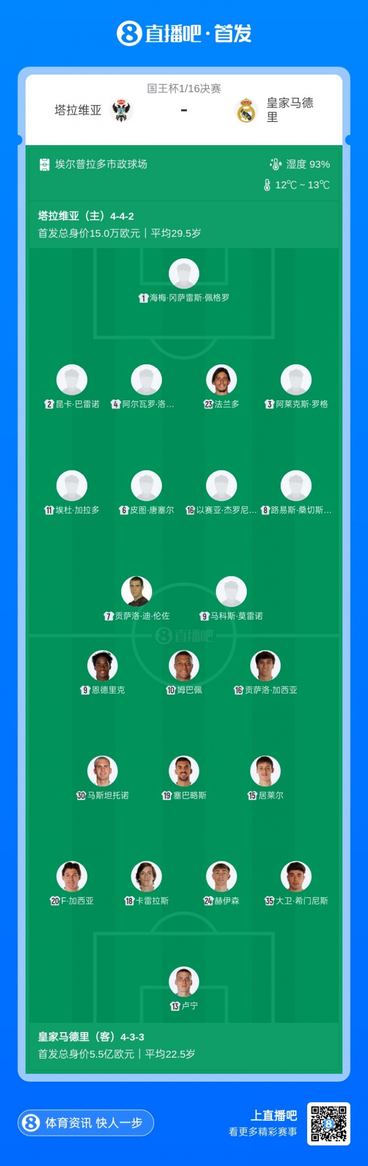 直播吧12月18日讯 北京时间12月18日4:00,西班牙国王杯1/16决赛,皇马客战西协甲球队塔拉维亚。赛前双方公布了首发阵容。【皇马方面,姆巴佩搭档恩德里克组成锋线,卡雷拉斯客串中后卫;卢宁任场上队长。】