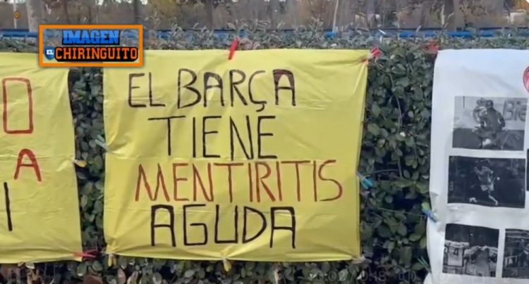对于拉波尔塔的言论,皇马球迷显然有着不同的意见。在俱乐部训练基地外,皇马球迷打出了巴萨“撒谎成性”的横幅。