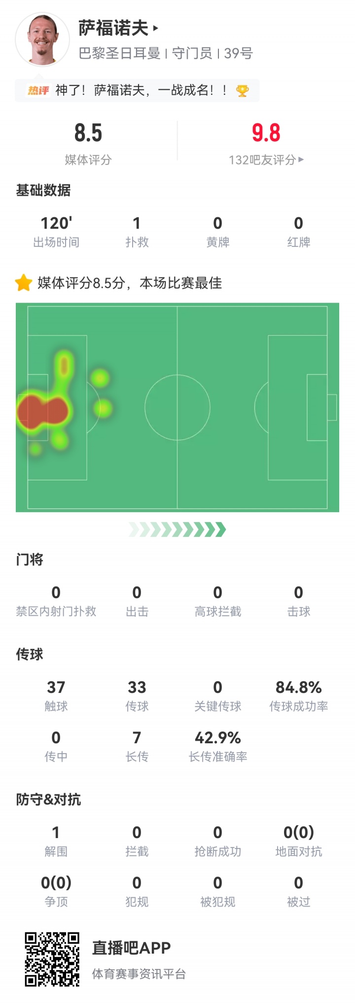 一战成名!巴黎门将萨福诺夫全场数据:点球大战连扑4点!