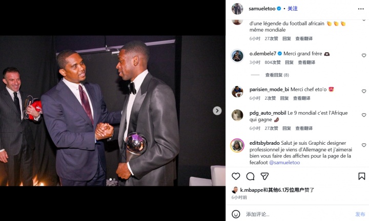 登贝莱本人也现身评论区:“感谢你,老大埃托奥!”值得一提的是,姆巴佩也点赞了这一帖子。
