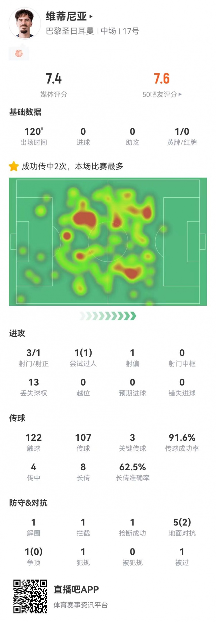 直播吧12月18日讯 巴黎在洲际杯决赛点球击败弗拉门戈,维蒂尼亚本场数据如下: