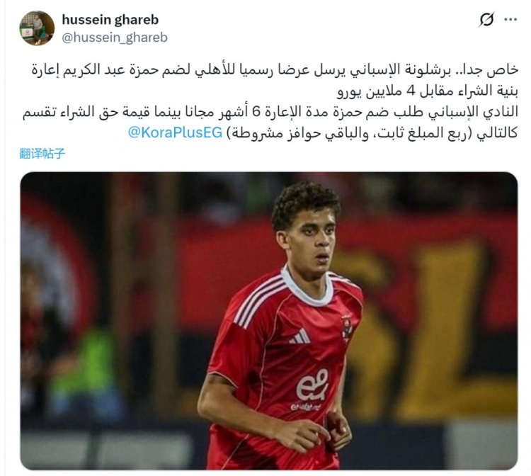 Hussein ghareb透露,巴萨有意哈姆扎·阿卜杜勒卡里姆,已向开罗国民提交了一份租借+选择买断的正式报价。