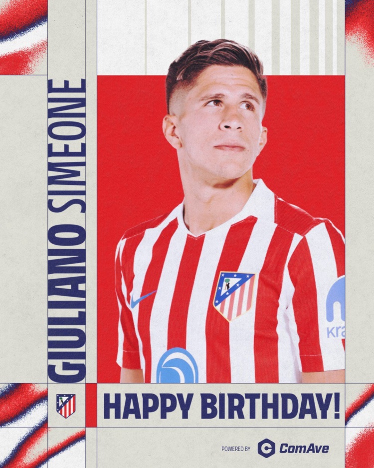 马竞官方社媒晒出朱利亚诺·西蒙尼的生日海报,配文:“生日快乐,朱利亚诺!”