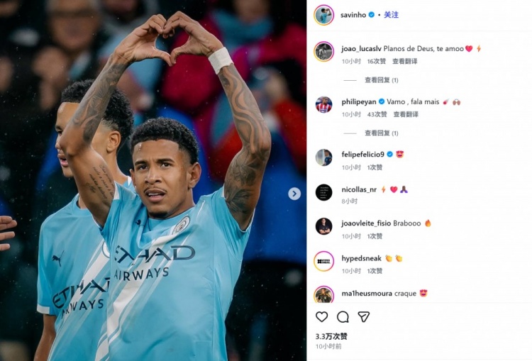 萨维尼奥同样通过社媒晒出自己比心的庆祝照,但并未附加文字内容。