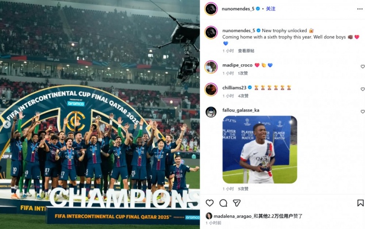 他也在赛后通过社媒晒出全队捧杯照,并配文:“解锁新奖杯🔐带着今年的第六座奖杯回家!干得漂亮,小伙子们👊🏾❤️💙”