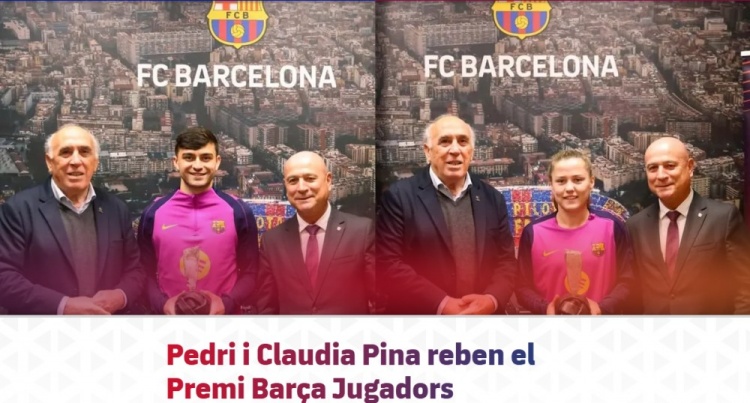 直播吧12月18日讯 巴萨佩德里和克劳迪娅·皮娜获得了巴塞罗那球员奖,这是俱乐部球员协会每年颁发的奖项,旨在表彰球员在该赛季展现出的公平竞赛精神。协会主席胡安·曼努埃尔·阿森西和俱乐部董事何塞普·伊格纳西·马西亚在体育城举行的仪式上负责向球员颁奖。