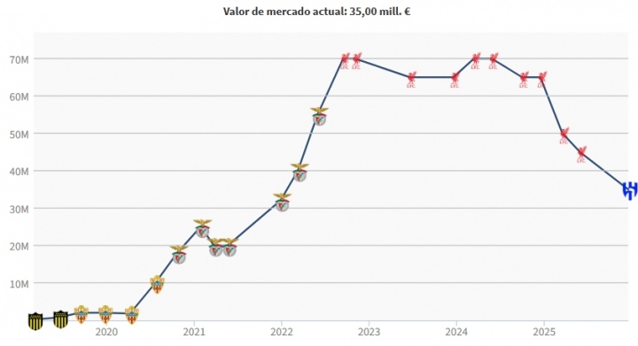 今年夏窗努涅斯以5300万欧元的转会费,从利物浦加盟利雅得新月。本赛季努涅斯代表新月出战11场比赛,贡献5粒进球和2次助攻。效力利物浦时期,努涅斯的最高身价曾达到7000万欧元。