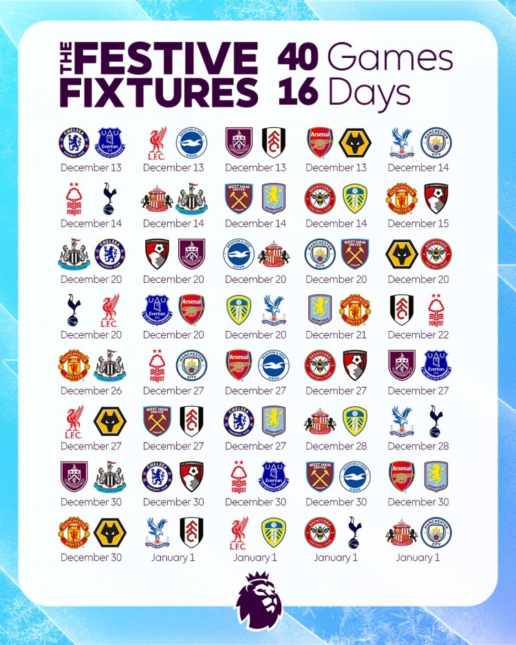 直播吧12月18日讯 英超官方更新社媒动态,晒出节日期间赛程图片。