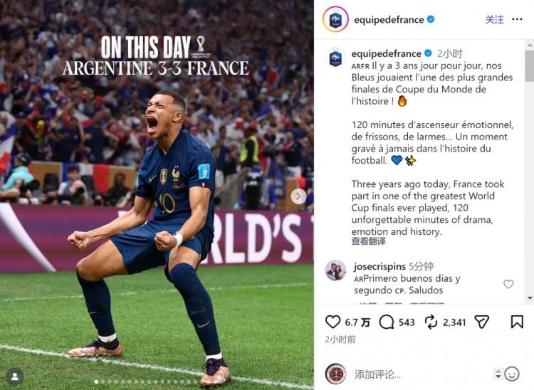 法国队官方社媒晒出姆巴佩庆祝进球的照片,配文:“3年前的今天,法国队参加了史上最精彩的世界杯决赛之一。那是120分钟令人难忘的戏剧性、情感与历史时刻的交织。”