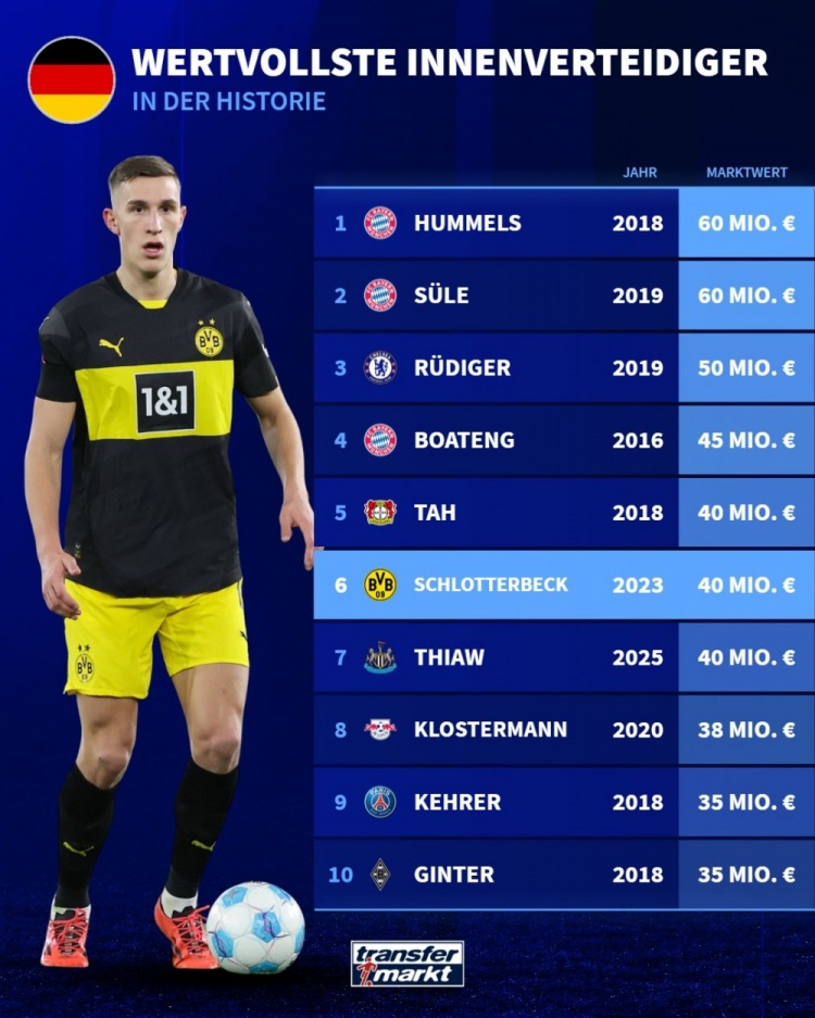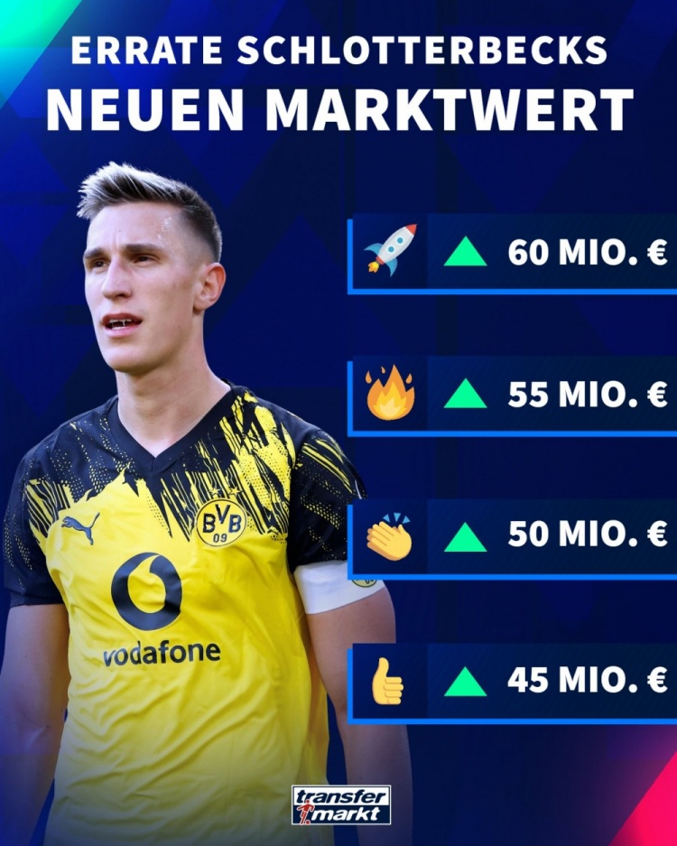 直播吧12月18日讯 德国转会市场预热多特中卫施洛特贝克最新身价,最高可能达到6000万欧,最低4500万欧元。