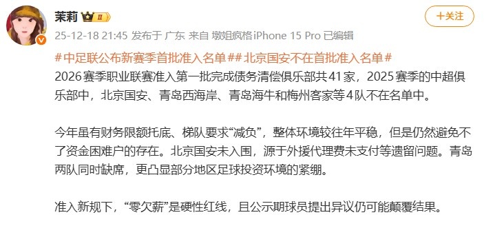 直播吧12月18日讯 中国足球职业联赛联合会公示了2026赛季职业联赛准入第一批完成债务清偿的俱乐部名单,中超俱乐部中,北京国安、青岛西海岸、青岛海牛和梅州客家等4队不在名单中。记者发文透露国安未入围源于外援代理费未支付等遗留问题。
