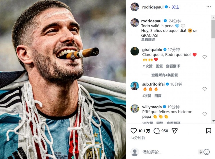 在社交媒体上,德保罗晒出了自己叼着雪茄,身上披着球网的照片,并写道:一切都值得!今天,是那个特别日子的纪念日!