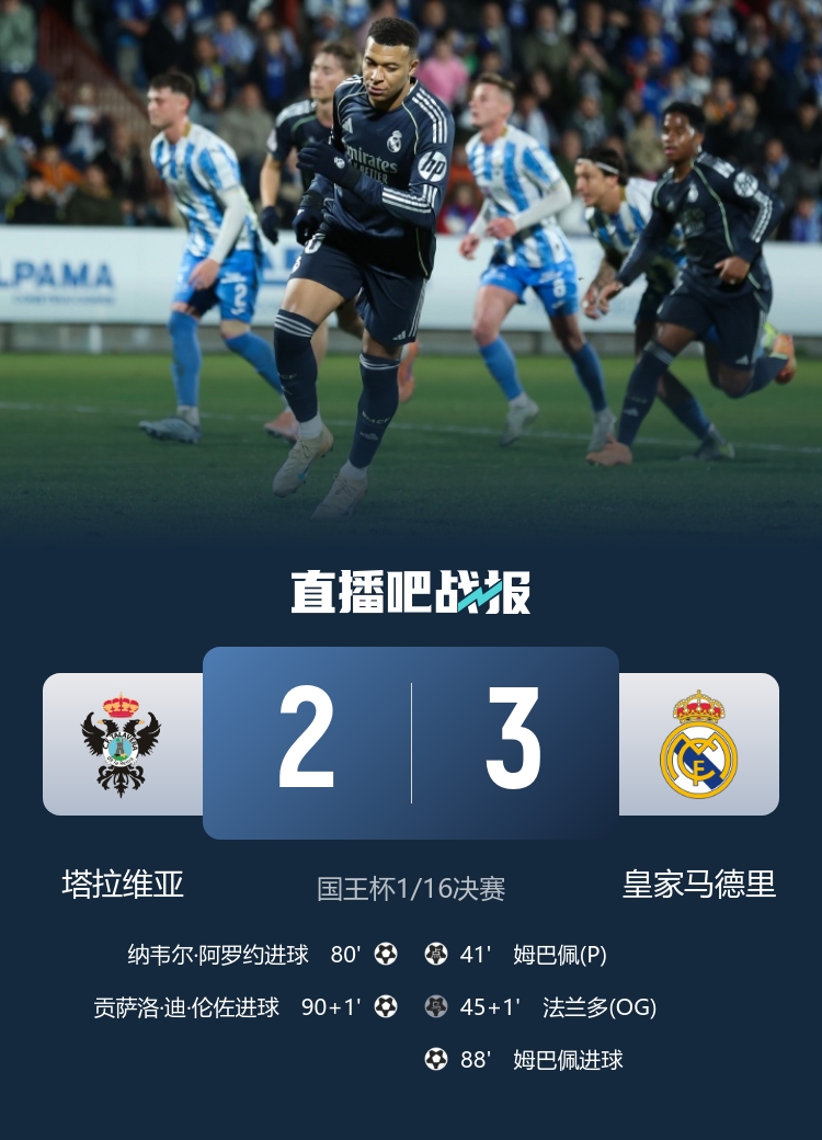 直播吧12月18日讯 北京时间12月18日4:00,西班牙国王杯1/16决赛,皇马在埃尔普拉多市政球场客战西协甲球队塔拉维亚。上半场姆巴佩失单刀,随后马科斯·莫雷诺手球送点,姆巴佩点射得手,尾声阶段,姆巴佩传球造成法兰多自摆乌龙,皇马暂2-0塔拉维亚;下半场姆巴佩再失单刀,纳韦尔扳回一球,姆巴佩远射得手,迪·伦佐补时破门,最终皇马3-2塔拉维亚,晋级16强。