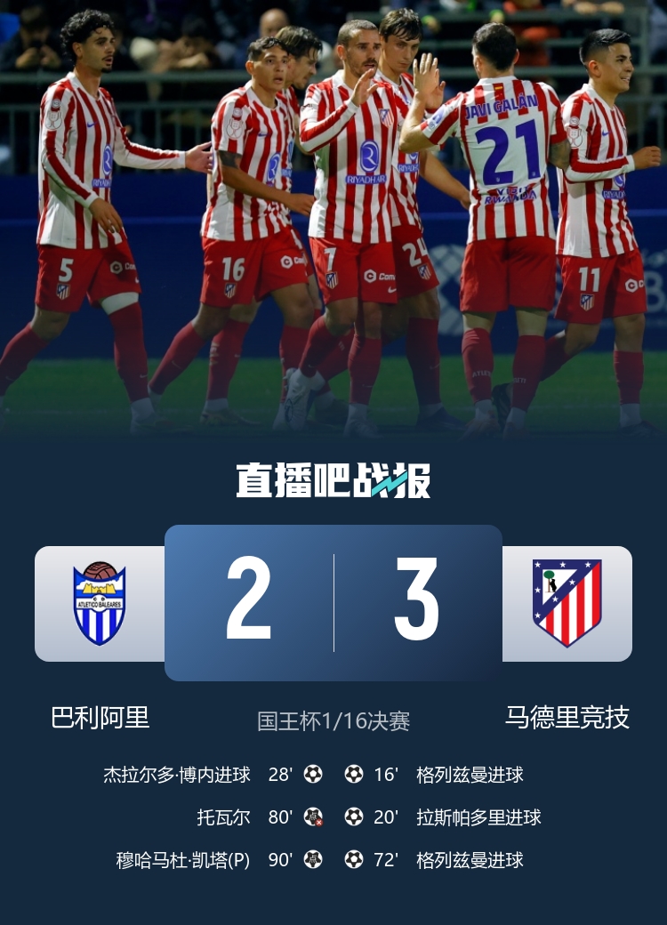 直播吧12月18日讯 北京时间12月18日02:00,国王杯32强马竞挑战巴利阿里的比赛在进行,上半场朗格莱伤退,加拉格尔助攻格列兹曼推射首开记录,莫利纳助攻拉斯帕多里头球扩大比分,博内特头球扳回一城,下半场加兰助攻格列兹曼完成双响,穆索送点+扑点,凯塔点射扳回一城,最终马竞3-2巴利阿里晋级下一轮。