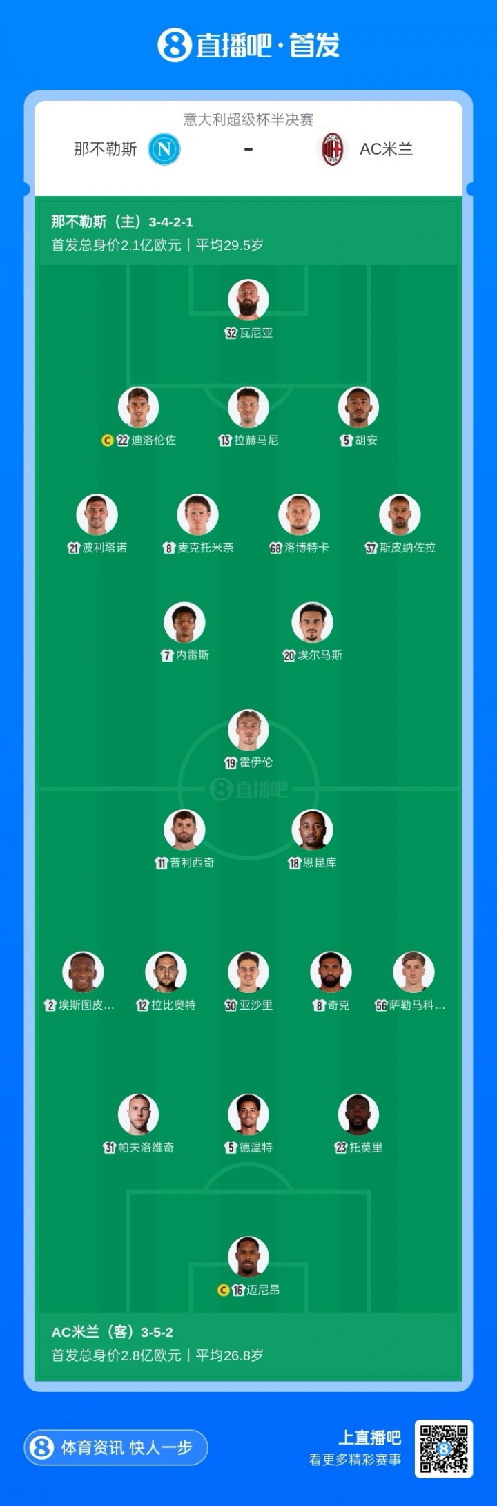 那不勒斯首发:32-瓦尼亚、22-迪洛伦佐、13-拉赫马尼、5-胡安、21-波利塔诺、68-洛博特卡、8-麦克托米奈、37-斯皮纳佐拉、7-内雷斯、19-霍伊伦、20-埃尔马斯