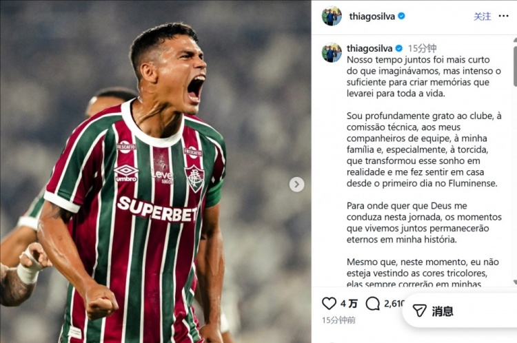 直播吧12月19日讯 在离开弗鲁米嫩塞后,蒂亚戈·席尔瓦通过社交媒体进行了告别。