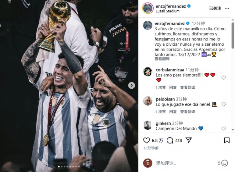 恩佐写道:“这个美妙的三周年纪念日。在那几个小时里,我们如何煎熬、哭泣、享受并庆祝,我将永生难忘,它将永远留在我心中。感谢阿根廷给予如此多的爱,2022年12月18日。”