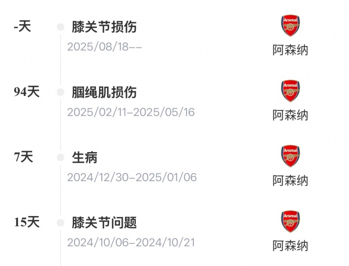 哈弗茨加盟阿森纳以来的伤病记录,今年上半年几乎报销,下半年也……