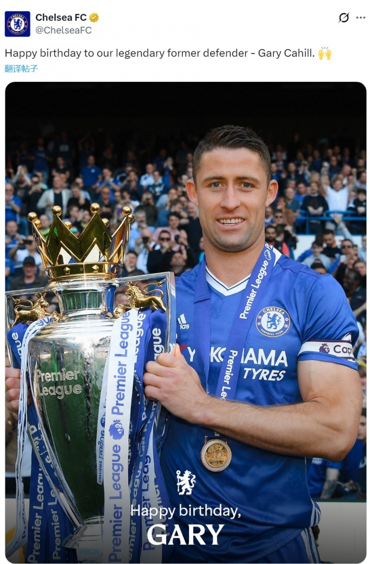 切尔西社媒晒出卡希尔与英超奖杯的合照,配文:“祝我们的传奇后卫加里·卡希尔生日快乐。”