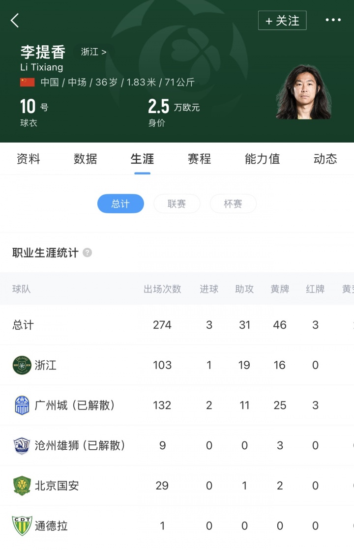 李提香,自2023赛季加入浙江以来,已累计出场103次,贡献1粒进球与19次助攻。上赛季李提香作为主力中场,为浙江队各项赛事出场31场贡献8次助攻。