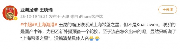 王晓瑞在个人微博写道:玉昆的确正联系某上海希望之星,但不是Kuai Jiwen。联系的是国产中锋,为巴乙新外援预备一个轮换。至于流言怎么出来的呢,显然只听说了“上海希望之星”,没搞清楚具体人名。