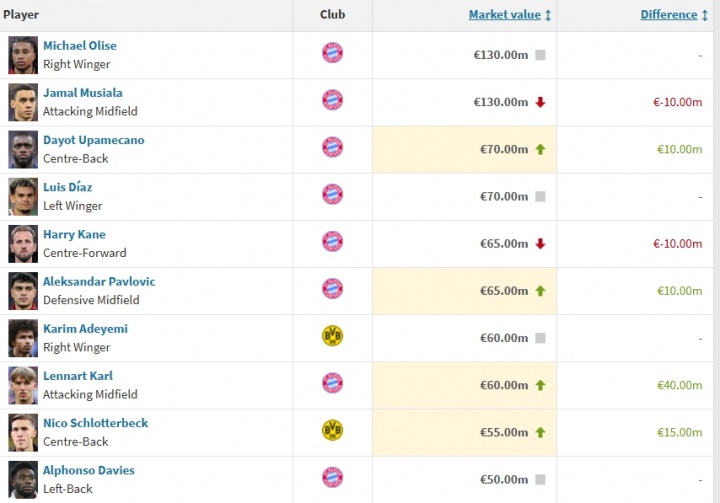 德转管理员对于穆西亚拉和凯恩的评语是:穆西亚拉仍在从重伤中恢复,目前还无法准确预见他何时能重返赛场。凯恩的身价下降则完全是由于年龄增长,这是凯恩身价连续第四次下降,这次下降了1000万欧。