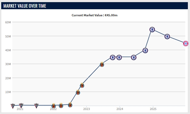 >下降500万!杰克逊目前代表拜仁5球1助,最新身价降至4500万欧
