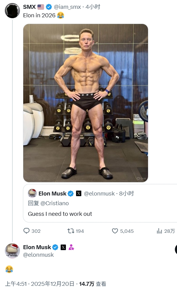 在看到40岁的C罗拥有如同刀刻斧凿般的肌肉后,马斯克在社交媒体上评论道:“我想我需要锻炼一下了”。
