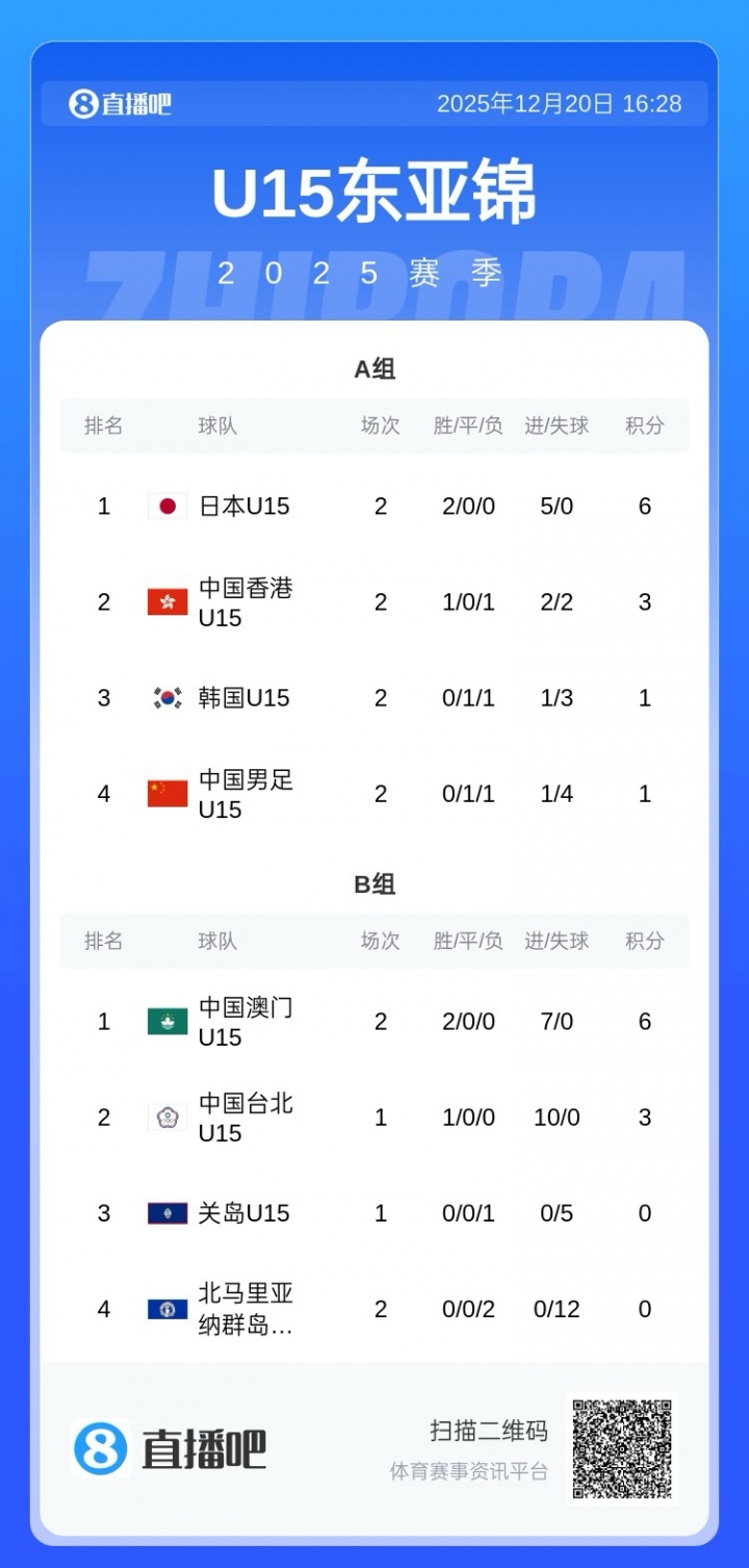 A组积分榜,日本U15两连胜进5球0失球小组第一,中国香港U15两场1胜1负第二,韩国U15两场1负1平第三,国少两场1负1平进1球丢4球继续垫底。