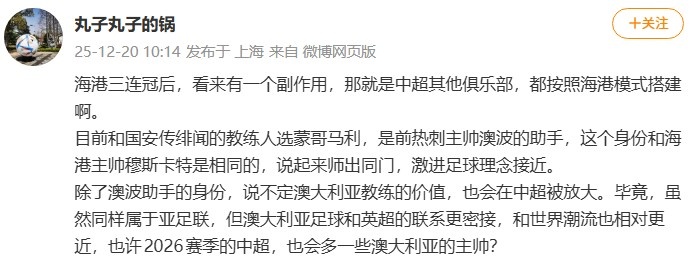 除了澳波助手的身份,说不定澳大利亚教练的价值,也会在中超被放大。毕竟,虽然同样属于亚足联,但澳大利亚足球和英超的联系更密接,和世界潮流也相对更近,也许2026赛季的中超,也会多一些澳大利亚的主帅?”