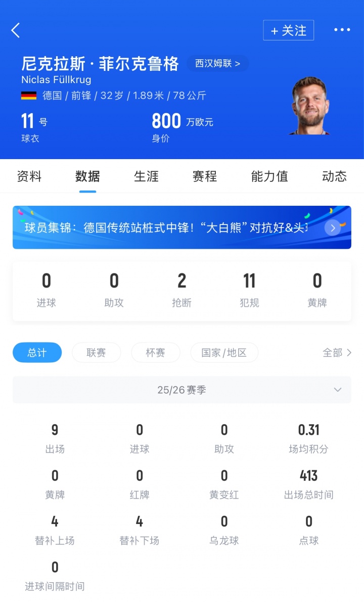 菲尔克鲁格明年2月满33岁,德转身价800万欧,本赛季在西汉姆出场9次,英超8场、联赛杯1场,均未收获进球或助攻。