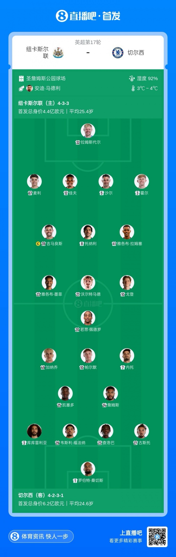 纽卡首发:32-拉姆斯代尔、3-刘易斯·霍尔、5-沙尔、12-佳夫、8-托纳利、39-吉马良斯、41-雅各布·拉姆塞、67-麦利、10-戈登、23-雅各布·墨菲、27-沃尔特马德