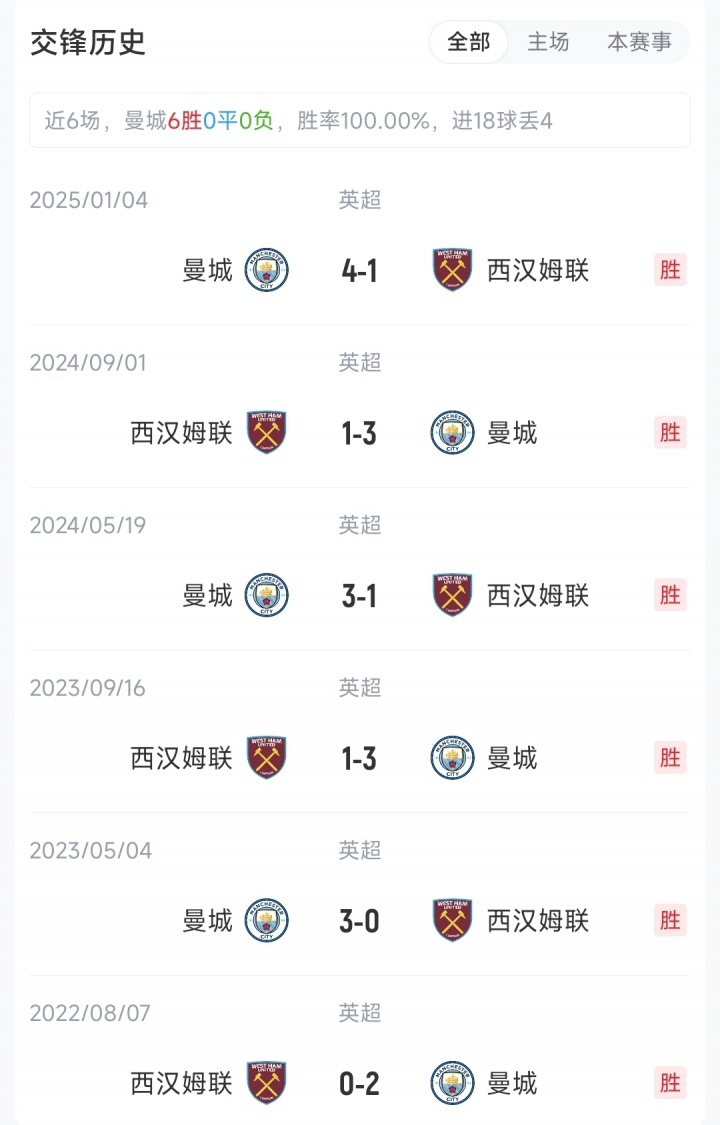 截至赛前,曼城11胜1平4负积34分,排名英超积分榜第2;西汉姆联3胜4平9负积13分,排名英超积分榜第18。
