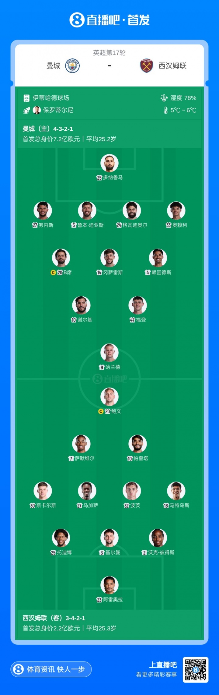 直播吧12月20日讯 北京时间今晚23点,英超第17轮,曼城主场迎战西汉姆联,赛前双方公布首发阵容。曼城方面,哈兰德、福登、谢尔基领衔锋线,赖因德斯坐镇中场,多库继续因伤缺阵。