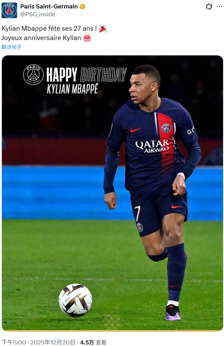 直播吧12月20日讯 今天是法国前锋姆巴佩27岁生日,他的老东家巴黎圣日耳曼在社媒为姆巴佩送上生日祝福。