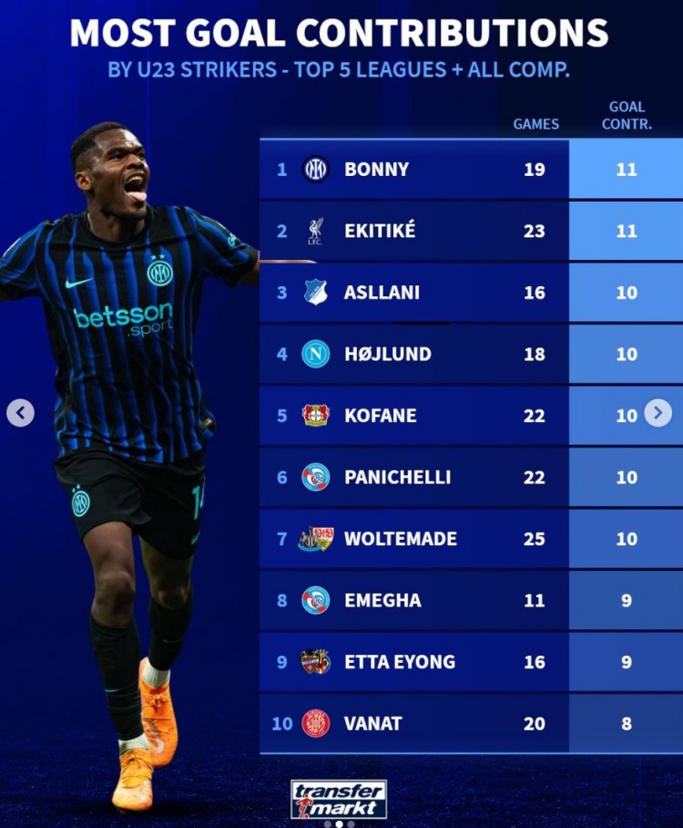 直播吧12月20日讯 《转会市场》统计了本赛季五大联赛U23前锋各项赛事参与进球情况,博尼、埃基蒂克各参与11球最多。