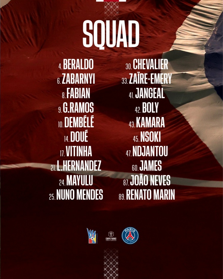 中场:8-法比安、17-维蒂尼亚、24-马尤卢、33-扎伊尔·埃梅里、41-让格尔、45-恩索基、87-若昂-内维斯