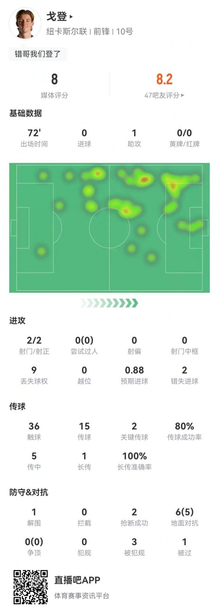 直播吧12月20日讯 纽卡在本轮英超主场对阵切尔西,戈登本场数据如下: