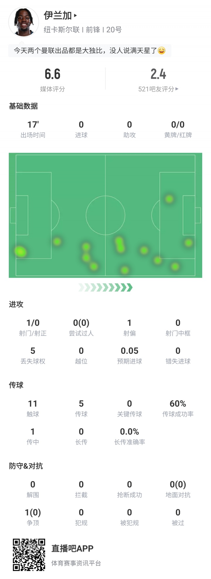 直播吧12月20日讯 英超第17轮,纽卡2-2战平切尔西,23岁伊兰加替补登场表现依旧欠佳,不仅被曼联前队友加纳乔生断,同时还错失良机。