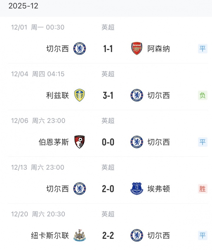 本场过后,切尔西5轮仅胜埃弗顿,打平阿森纳、伯恩茅斯、纽卡,输给利兹联。