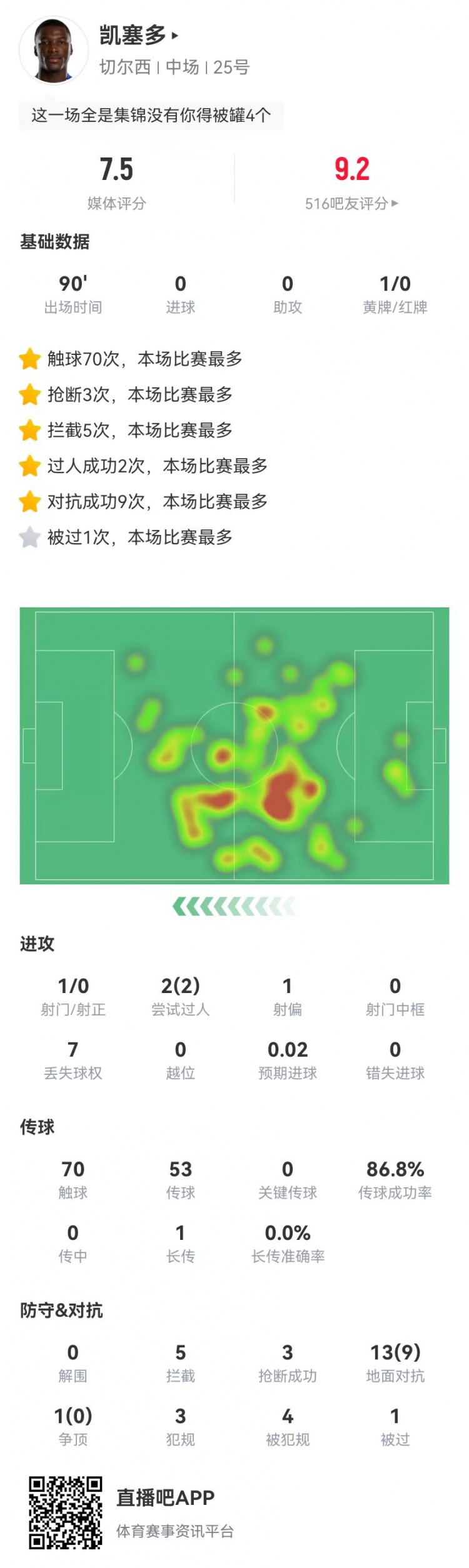 直播吧12月20日讯 切尔西在本轮英超2-2战平纽卡,凯塞多本场数据如下: