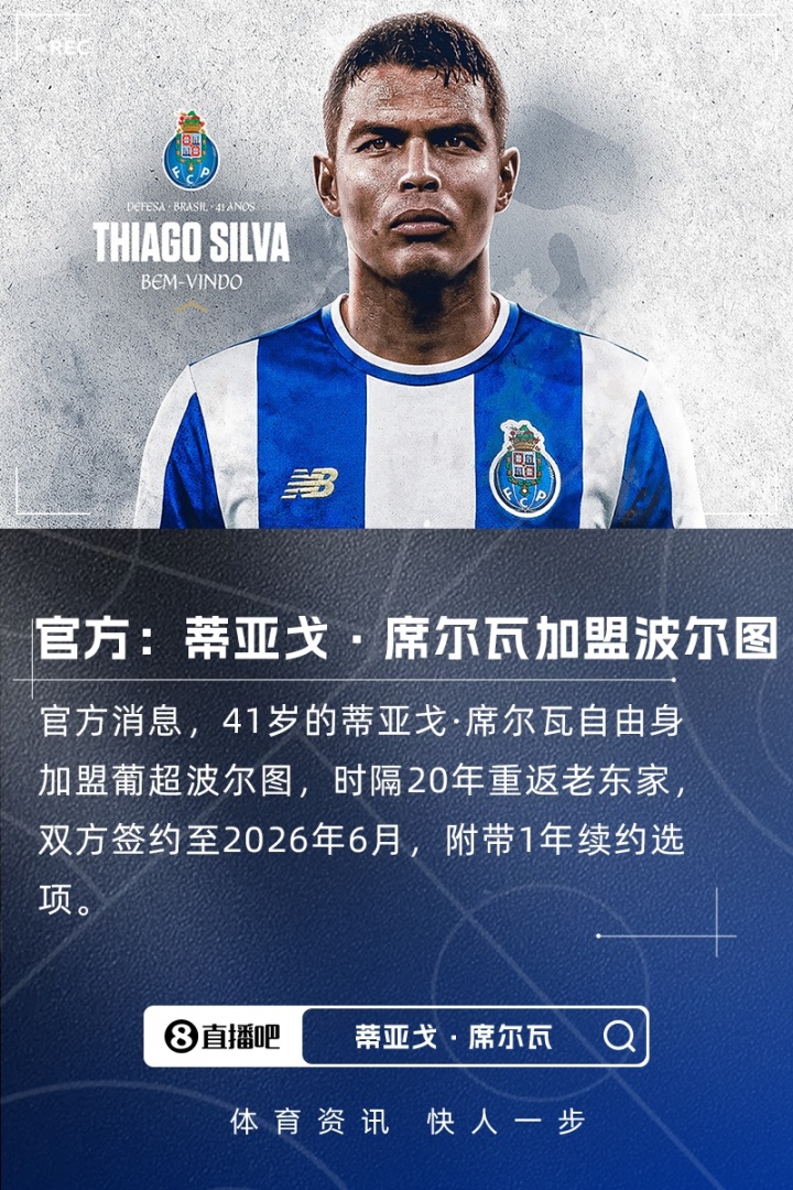 直播吧12月20日讯 波尔图官方消息,41岁蒂亚戈·席尔瓦自由身加盟球队,双方签约半年。