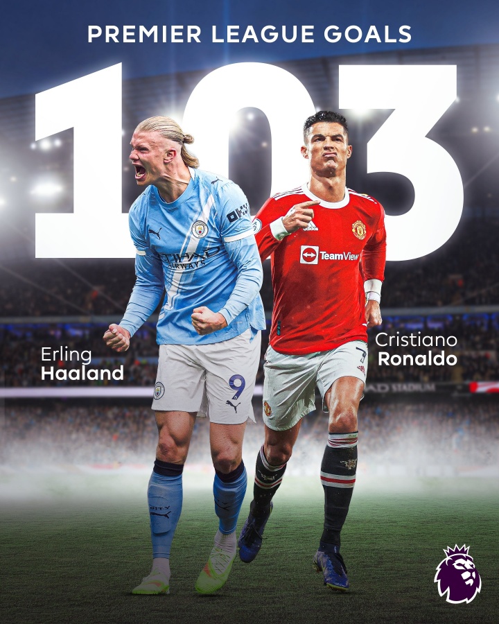 至此,哈兰德在英超的进球已经来到103粒,这追平了C罗在英超的进球数。