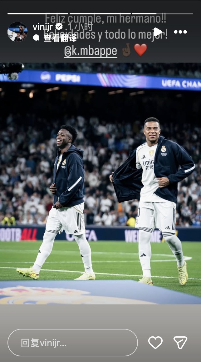 >😘哥俩好!维尼修斯为姆巴佩庆生:生日快乐我的兄弟,一切顺利